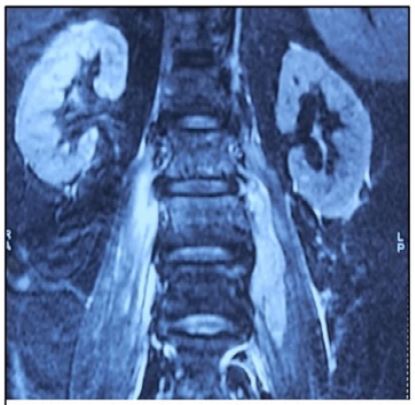 60-year-old gentleman was admitted due to low backache and fever for eight days. There was tenderness in the left paraspinal lumbar region at L2-L3 level and an ejection systolic murmur in the left parasternal region. On further enquiry, the patient mentioned that he had the murmur since childhood but was never evaluated for it.