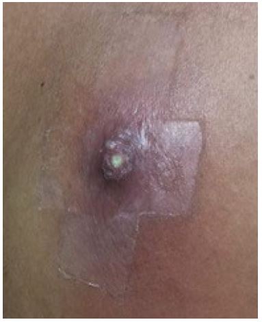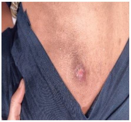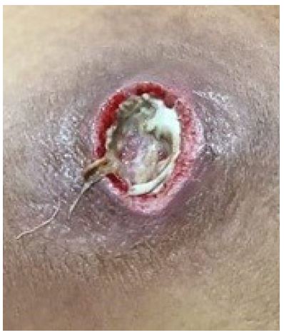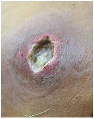 Inspection: The abscess was located over back the left sided sub scapular region. On the first visit, the ulcers measured 5 cm by 4 cm, respectively, and were oval in shape, 10 mm to 12 mm deep, with a sero-purulent discharge that was usually shallow, with irregular slopping edges and fibrotic margins. The floor consisted of fibrinous exudate and unhealthy granulation.