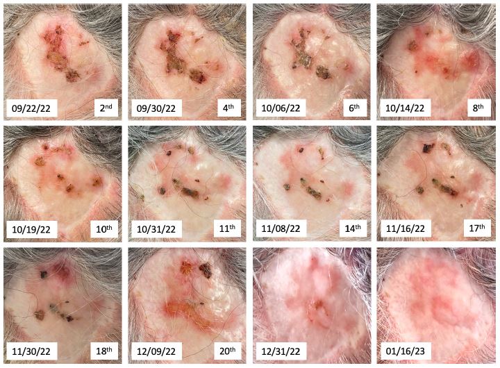 An overview of the wound healing process during low-level LED light therapy is depicted in Figure 2. Within the first eight times of applying red light therapy, some regions were regenerated via crust formation and detachment, while new inflammatory foci appeared (Figure 2, first row). This pattern repeated itself between the 10th and 20th time of therapy. Overall, a reduction of the sore region was observed and after completion of the red-light therapy, the wounds were completely healed within about a month (Figure 2, last two images). A follow-up after approximately eight months showed a completely closed, non-inflamed transplant area (Figure 3), which has been maintained to date (two years later).