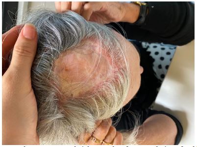 The case of a 73-year-old Caucasian female who was diagnosed with BCC in 2017 at the age of 67 is presented. Originally, two basaliomas were located high parietal (site A) and high occipital (site B) on the scalp which were surgically removed in September 2017. Two years later, additional excision procedures were necessary in July and August 2019 due to recurrence and failure to completely remove the BCCs.