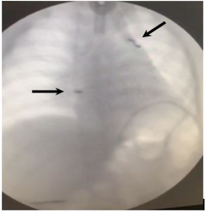 Considering, the bilateral character of affection, impossibility of spontaneous breathing, and damage of nerves phrenicus, it was decided to do not apply the diaphragmatic plication but implanted the Diaphragm Pacemaker (Avery Biomedical Devices, Inc. USA) (Figure 1). The informed consent of parents for the applying of such method of treatment was received