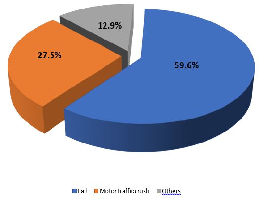 On the etiology of TSCI this study found that falls from heights were the leading cause of TSCI at 59.6% (most patients fell from avocado and mango trees), followed by motor traffic accidents at 27.5% and other causes accounted for 12.9%. This may be due to increasing demand of mangoes and avocadoes as a commercial fruits/product, which are abundant in Kilimanjaro and thus during their seasons many peasants are involved in climbing the trees for harvesting the fruits and thus end up falling and acquiring TSCI.