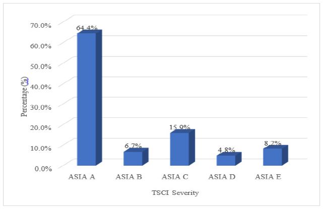 The severity of TSCI among patients admitted at KCMC from October 2020 to September 2023 was as follows; ASIA A 127(63.2%), ASIA B 14(6.9%), ASIA C 33(16.5%), ASIA D 10(4.9%) and ASIA E 17(8.5%). This is shown on (Figure 3).