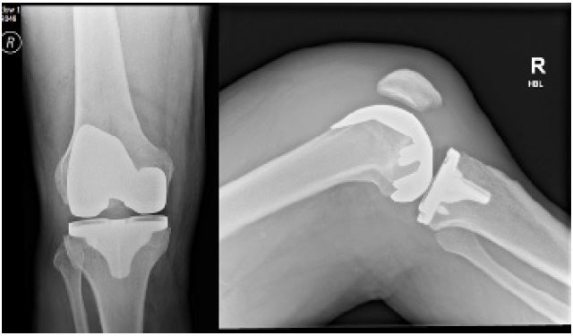 A 69-year-old male underwent right side robotic assisted total knee replacement for severe grade 4 knee osteoarthrosis in August 2023. His surgery was uneventful and he was discharged home with routine physiotherapy protocol and venous thromboprophylaxis. He was recovering well until 4 weeks after surgery when he presented in the emergency department with acute onset of pain and swelling of the right knee. He was able to weight bear and didn’t have any spike of fever. There wasn’t any history of bleeding disorder and he had already completed his 2 weeks of VTE prophylaxis medications. Clinical examination showed moderate to large diff use swelling around the knee, mildy raised temperature as compared to the other side, no significant erythema or redness. He had a range of motion of the knee from 10-90°. His blood tests for inflammatory markers showed C-Reactive Protein (CRP) 5 mg/dL and White Cell Count (WBC) of 6.8×109/ L. Radiographs of the right knee showed loss of supra and infra patellar fat pad suggestive of gross joint eff usion (Figures 1 & 2). His knee was aspirated with around 100 ml of dark colored frank blood which raised the suspicion of venous bleeding. The cultures were negative. He was sent home with advice of icing and elevation of knee at rest.