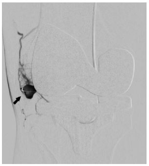 Angiography by involving Interventional radiologist has been described the first line procedure in diagnosis of such cases [7]. This technique is also useful in ruling out arteriovenous fistulas and pseudoaneurysms [8,9]. Once the diagnosis in confirmed , selective arterial embolization of the geniculate arteries is the procedure of choice which decreases the blood flow to the soft tissues and synovium around the total knee replacement. Weidner [4] described a case series which reported as Geniculate arterial embolization lead to resolution of hemarthrosis in 12 of 13 patients (92.3%). The one clinical failure likely represented a case of misdiagnosed periprosthetic joint infection. In their study, the average interval between arthroplasty and embolization was 47 months (Range 2 to 103 months), and the average time from onset of hemarthrosis to embolization was 4.1 months (Range 1 to 11 months).