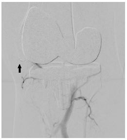 In another series of five patients reported by Bagla et al. [3] which presented with spontaneous hematemesis after total knee replacement, selective arterial embolization was performed with spherical embolic particles (diameter range, 100-700 μm). Angiography demonstrated synovial hypervascularity with geniculate artery “tumor blush” appearance in all patients. The average time to resolution of eff usion was 2.6 weeks, with no recurrences reported during follow-up (mean, 25.4 month; range, 16-48 months).
