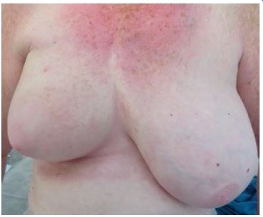 Breast cancer is the most common cancer diagnosed in women worldwide constituting 24.2% of all new cancer diagnoses [1]. Radiotherapy for breast cancer reduces recurrence and breast cancer death [2]. Morphea, also known as localising scleroderma, is a rare complication of radiotherapy reported to effect one in every 500 patients [3,4]. There is limited data pertaining to the propensity of specific patient factors to increase the risk of development of specific types of morphea. In the setting of generalised morphea the prevalence is four times more likely in those with underlying autoimmune disease in their family history [5] yet it is unknown if this extends to those who develop morphea after radiation therapy.