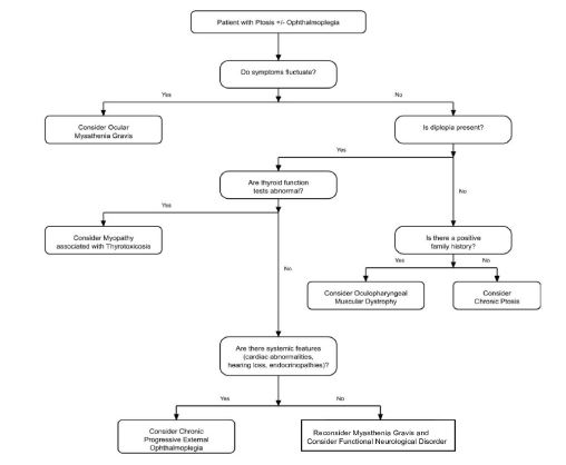 OMG is an autoimmune disorder of the neuromuscular junction that causes fluctuating eyelid drooping (ptosis) and double vision (diplopia). Because many other conditions can produce similar eye findings, it is important to recognize “myasthenic mimics” – disorders with ptosis and ophthalmoplegia that overlap with OMG but have different causes and features. (Table 1) summarizes common OMG mimics, their etiologies, and key clues that distinguish them from true ocular myasthenia. In general, mimics tend to have non-fluctuating, progressively worsening symptoms and no response to myasthenia-specific tests (e.g. no decrement on repetitive nerve stimulation and no improvement with edrophonium). Systemic features, genetic testing, and imaging often provide diagnostic clues. We discuss each category of mimic in detail, emphasizing overlapping and distinguishing features and how to approach diagnosis.