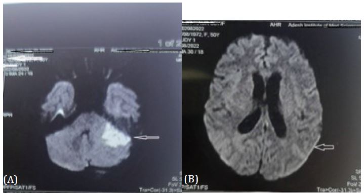 A 50 year female known case of Diabetes Mellitus since 5 years not on any medication presented in emergency with history of fever, altered sensorium and vomiting since one day. She was shifted to ICU. Her Glasgow coma score was 8 (E2V1M5), blood pressure of 130/70 mmHg, heart rate of 110/min and respiratory rate of 24/min. Both pupils were equal in size and normal reaction to light and nuchal rigidity was present. She was intubated due to poor GCS and put on mechanical ventilation. Contrast MRI Brain revealed acute infarct in left middle cerebellar peduncle and left cerebellar hemisphere, periventricular ooze and leptomeningeal enhancement on post contrast FLAIR (Figure 1). Her blood investigations were normal except for leukocytes count of 17500 cells/μL, random blood sugar of 396 and procalcitonin 2.3. Lumbar puncture was done. Cerebrospinal Fluid was turbid yellow and showed protein 274 mg/dl, glucose 23 mg/dl(corresponding blood sugar was 382 mg %) and a total leucocyte count of 280/mm3 (neutrophills - 70%, Lymphocytes – 2%), no organism on gram ZN, Gram staining and KOH prepration. The CSF was also negative for gene expert for Tuberculosis, Polymerase chain reaction for herpes and cryptococcal antigen. She was treated with Monocef and vancomycin after Intravenous dexamethasone, Insulin infusion, intravenous fluids and other supportive treatment. Ear discharge was noted and sent for culture sensitivity. The culture after 24 hours revealed growth of gram-positive organism which later on confirmed to be methicillin resistant Staphylococcus Aureus (MRSA) sensitive to vancomycin. She responded to treatment with normalization of leucocytes and improved her GCS. On day 4, she was conscious oriented to time place and person, weaned from the ventilator and extubated. On day 9th, she was shifted in ward. After 2 weeks of intravenous antibiotlc therapy, she was discharged in stable condition on day 15th.