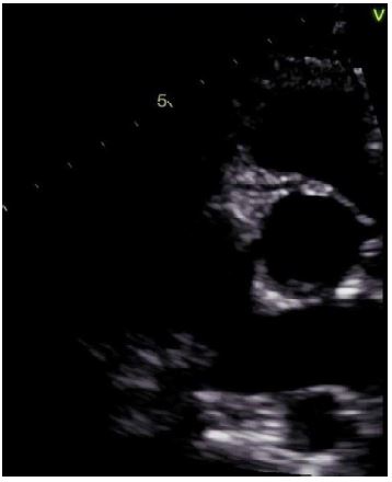 A 17-year-old male presented to the cardiology clinic for evaluation of a 3-year history of burning intermittent chest pain associated with exertion. He declined shortness of breath or loss of consciousness. His vital signs were unremarkable except for a blood pressure of 135/90. His family history was significant for hypertension. His physical exam and electrocardiogram (ECG) were normal. His 2D Echo suggested normal coronary origins (Figure 1), but color Doppler of the right coronary artery (RCA) was abnormal (Figure 2). An exercise stress revealed significant ST changes with ST depression and T wave inversion in inferior and lateral leads during maximum exercise and during recovery. CTA of the coronaries demonstrated that the RCA arose from the left wall of the ascending aorta, superior to the origin of the LMCA, with a 7mm intramural course and narrowed caliber (Figures 3 and 4). The RCA gave rise to the posterior descending coronary artery. After consideration of risks and benefits, he underwent unroofing of the RCA intramural course and tolerated the surgery without complications. He currently plays basketball with no symptoms.