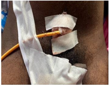 Furthermore, a multidisciplinary approach, including collaboration between genitourinary and plastic surgeons, plays a critical role in optimizing outcomes in complex avulsion cases. The use of wound debridement and rotational flap coverage, as performed in this case, is an essential part of management in extensive injuries where testicular salvage is no longer possible [5,6]. Additionally, the management of secondary complications, such as urinary retention, necessitates coordination with the genitourinary team. Suprapubic catheterization was performed in this case due to the patient’s inability to void urine, a common complication of severe pelvic trauma [8].