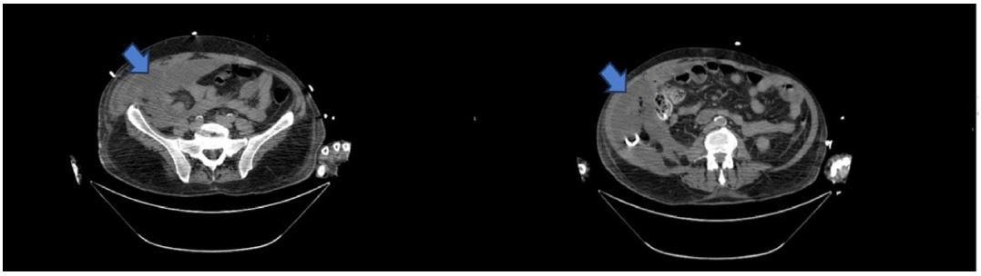 One month after admission, and while still intubated, the patient was readmitted to his original hospital. Upon readmission, he presented with fever and significantly elevated inflammatory markers. A thoraco-abdominal CT scan revealed a multiloculated hematoma in the right quadrants of the abdomen, with no signs of active bleeding. Percutaneous drainage of the collection yielded abundant purulent content.